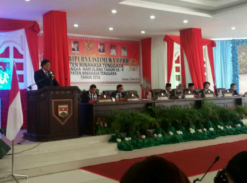 Gubernur Sulut, Olly Dondokambey saat menyampaikan sambutan HUT Mitra ke-9 di Aula paripurna DPRD Mitra, Senin (23/5) siang tadi.