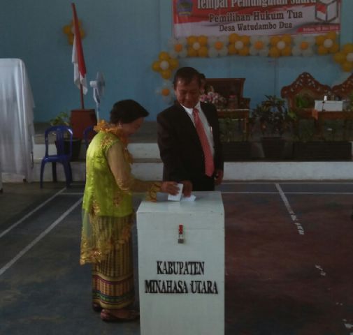 Rompis Rotty, Hukum Tua Desa Watudambo Dua terpilih periode 2016-2021 bersama Istri saat menggunakan hak suaranya di TPS balai Desa Watudambo. (Ist)