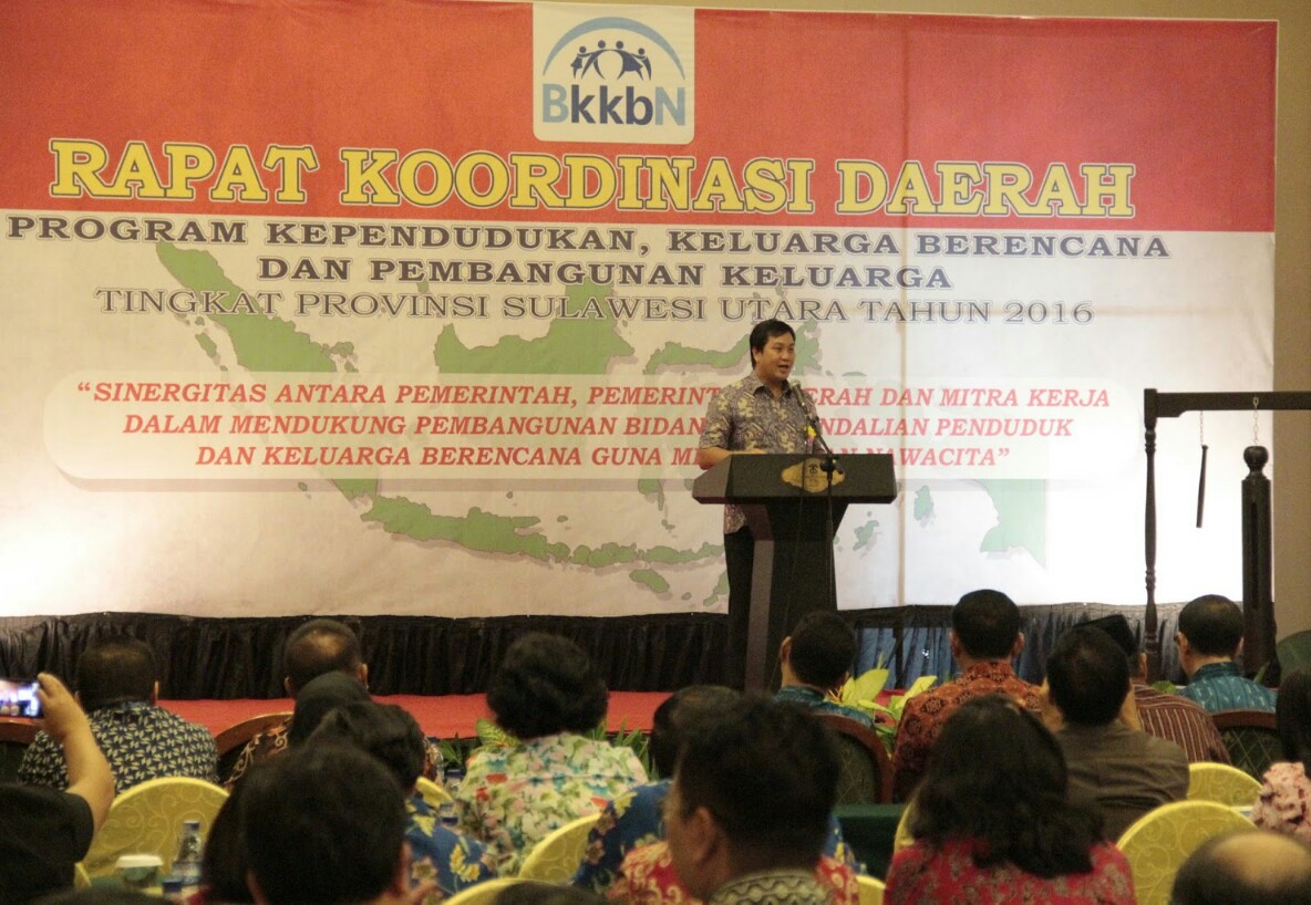 Wakil gubernur Sulut, Steven Kandouw saat membuka rakorda kependudukan KB dan Pembangunan Keluarga.