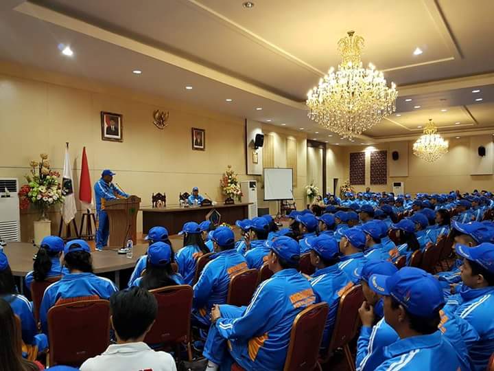 Gubernur Sulut Olly Dondokambey saat memberikan sambutan dan motivasi kepada para atlet utusan Sulut, sekaligus menyerahkan bendera kontingen kepada Wakil Gubernur, Steven Kandouw selaku Ketua kontingen Sulut. (ap/ist)