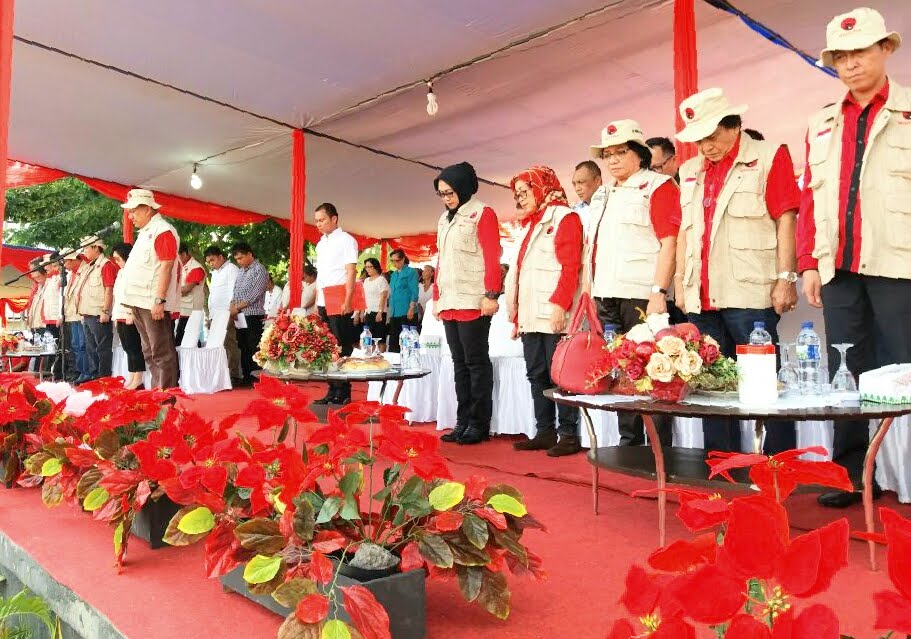 Gubernur Sulut, Olly Dondokambey saat menjadi Irup dalam apel akbar Baguna/Ketua DPP Baguna, Sadarestuwati dan Ketua Baguna Provinsi Sulut, Adriana Dondokambey (tengah,red).