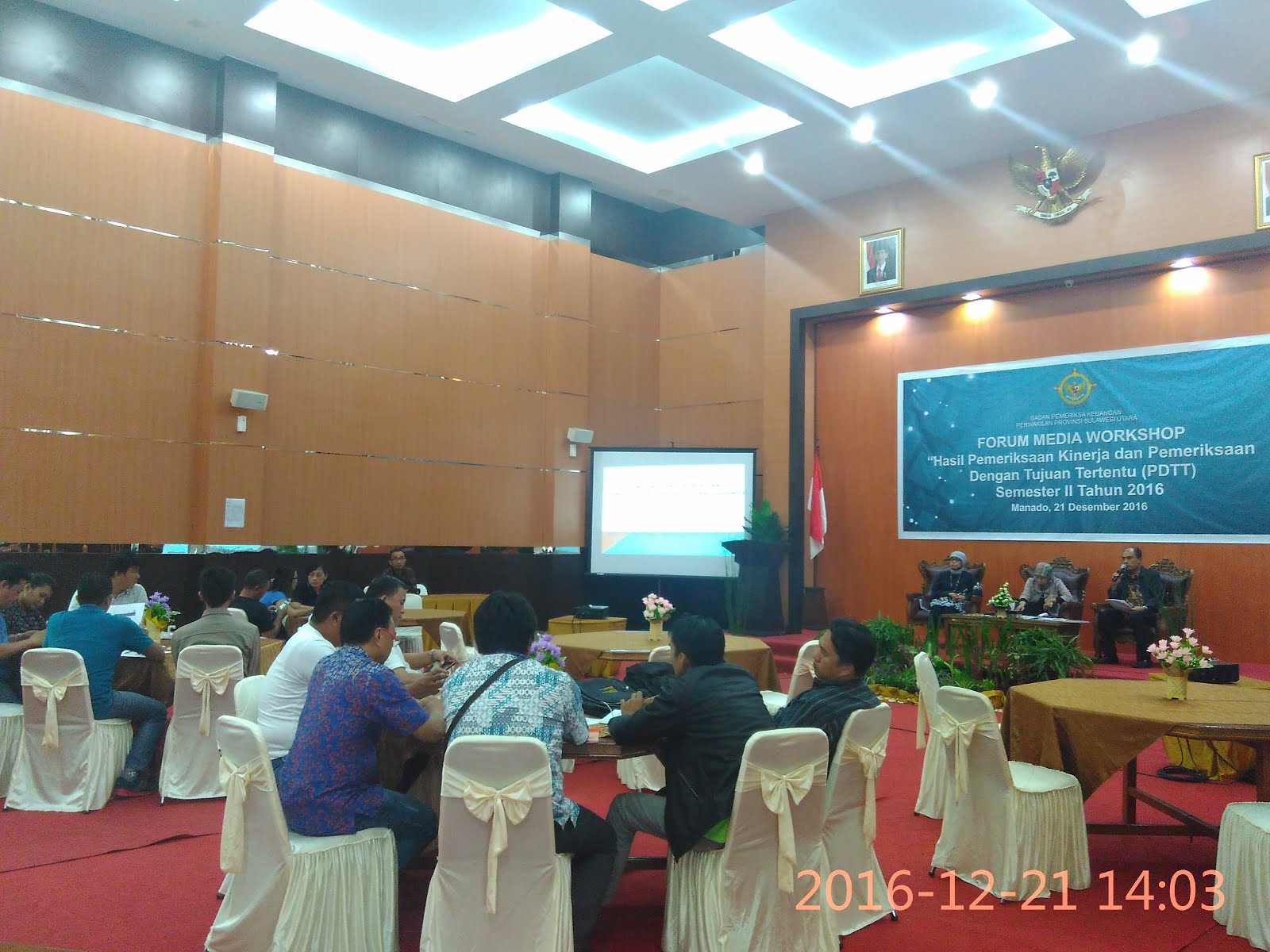 Foto kegiatan forum media work tentang ‘Hasil Pemeriksaan Kinerja dan PDTP semester II Tahun 2016’ oleh Ketua BPK Perwakilan Sulut, Endang Tuti Kardiani.