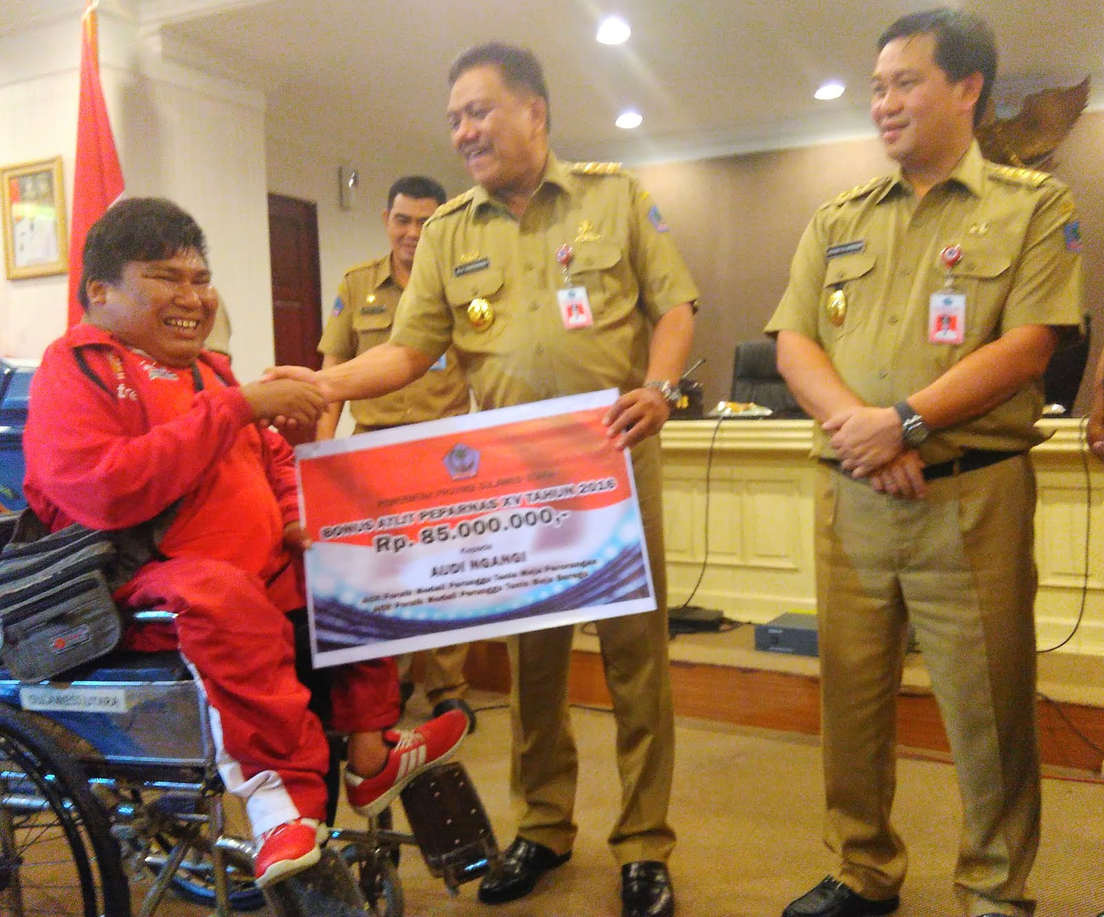 Manado, detiKawanua.com – Langsung ke masing-masing rekening bank para atlit Paralimpik, pelatih dan tandem olahraga yang telah berhasil meraih medali Emas, Perak dan Perunggu pada kejuaraan Pekan Olaraga Paralimpik Nasional (Peparnas) ke XV di Jawa Barat pada 2016 lalu, total uang pembinaan keseluruhan sebesar Rp 3,4 Miliar yang juga merupakan ‘bonus’ atas perjuangan mereka, oleh Gubernur Sulut, Olly Dondokambey pada Senin (13/03) siang tadi didampingi Wakil Gubernur Sulut, Steven Kandouw, Asisten III Roy O Roring, Plt Kadispora Sulut, Jani Lukas dan Ketua Harian Koni, Kolonel TNI AD Theo F Kawatu, bertempat di ruangan FJ Tumbelaka kantor Gubernur, telah dilakukan penyerahan secara langsung.