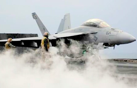 Sementara, F-18 didesain McDonnell-Douglas dan dibuat oleh Boeing, F/A-18E Super Hornet merupakan pesawat degan satu kursi, bermesin ganda, jet tempur multiperan yang sudah berada bersama AL AS sejak 1999. Pesawat ini nantinya akan digantikan dengan F-35C, namun tertunda akibat kekurangan dana. (dkc/mdk)