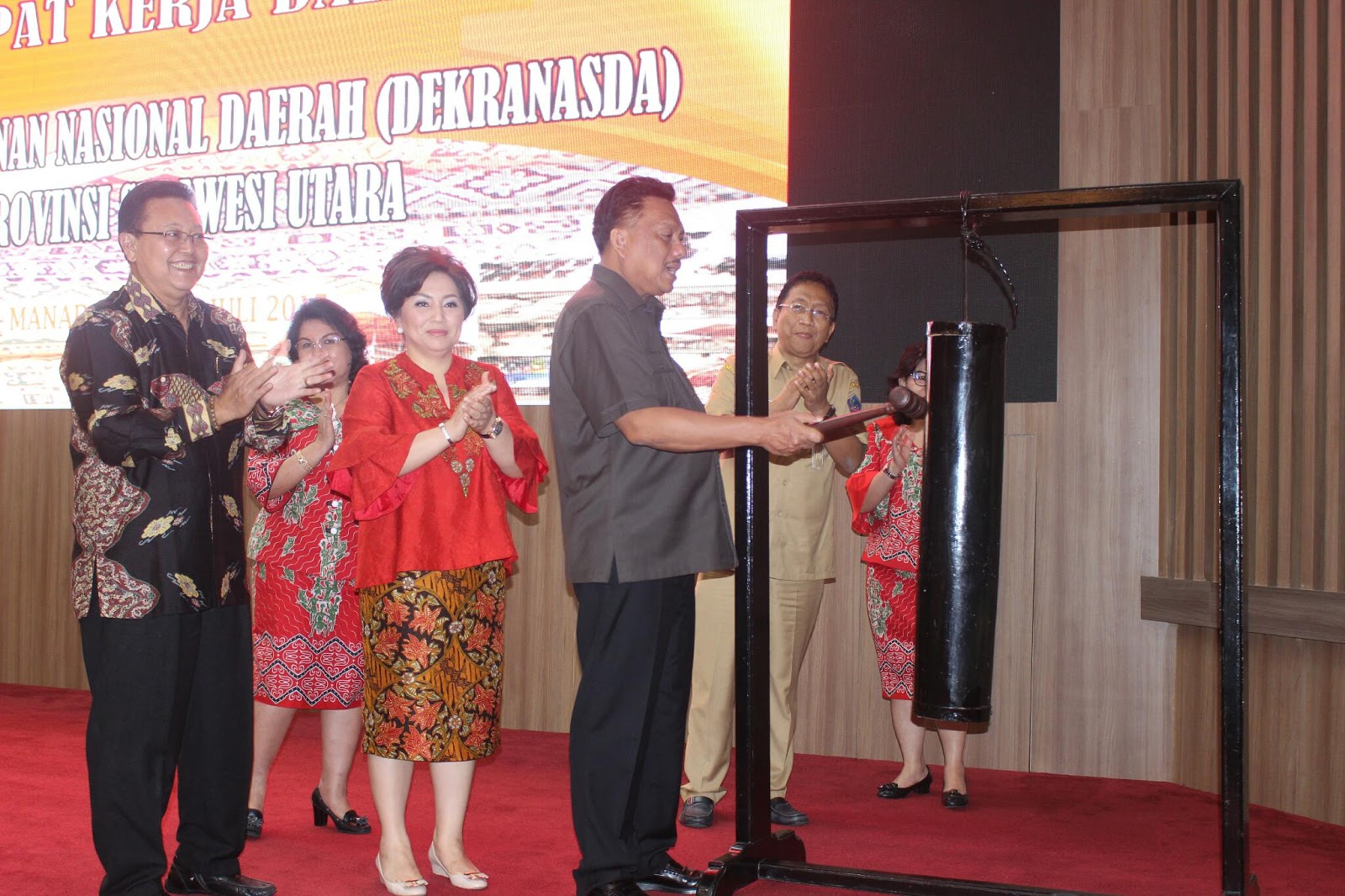 Adapun setelah menyampaikan sambutan, Gubernur yang didampingi istri tercinta yang juga Ketua Umum Dekranasda Sulut Ir Rita Tamuntuan, melakukan pemukulan Tetengkoren sebagai tanda resmi dibukanya agenda Rakerda Dekranasda.