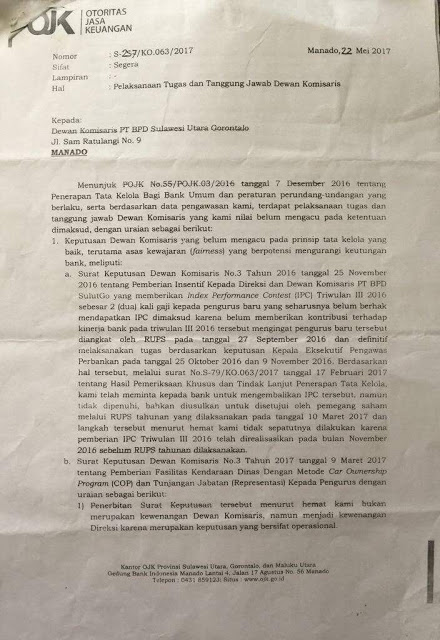 Dalam surat yang dilayangkan OJK pada point 1 butir A dijelaskan surat komisaris nomor 3 tahun 2016 tertanggal 25 November 2016 tentang pemberian index performance contest (IPC) Triwulan III 2016 sebesar 2 kali gaji pada komisaris baru yang sebenarnya tidak bisa dilakukan.