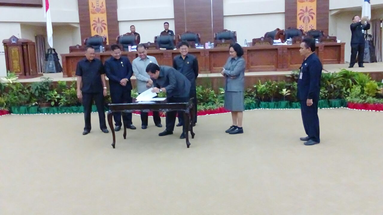 Usai penyampaian pendapat akhir fraksi-fraksi, Pimpinan DPRD dan ketua Pansus, Adriana Dondokambey menandatangani draft penertapan perubahan Perda RPJMD.