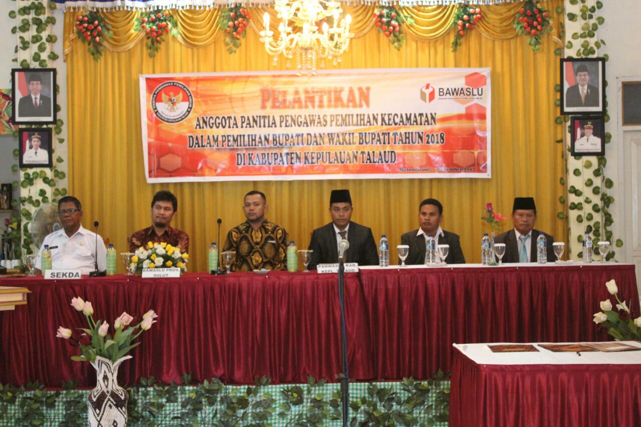 Talaud, detiKawanua.com – Panitia Pengawas Pemilu (Panwaslu) Kabupaten Kepulauan Talaud melantik 57 anggota Panitia Pengawas Pemilu  Kecamatan (Panwascam) dari 19 Kecamatan, dalam menghadapi  pesta demokrasi pemilihan Bupati dan Wakil Bupati Kepulauan Talaud tahun 2018, Pemilihan Umum Anggota DPR, DPD dan DPRD serta Pemilihan Presiden dan Wakil Presiden Tahun 2019 mrndatang di wilayah perbatasan antara Indonesia dengan Filipina.