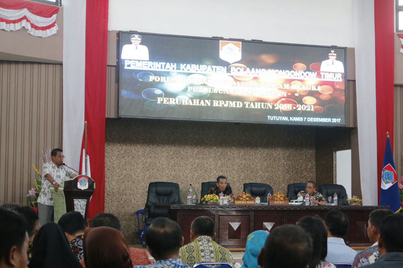 Sebelumnya, Kepala Bidang Litbang Bapelitbang Boltim, James Kinontoa menyebutkan, sedikitnya 4 tahapan telah dilaksanakan dalam proses perubahan RPJMD tahun 2016-2021 diantaranya, pembahasan indikator kinerja perubahan RPJMD, Orientasi tim penyusun dan FGD perubahan RPJMD tahun 2016-2021, Konsultasi publik perubahan RPJMD 2016-2021, dan Forum Perangkat Daerah yang dilaksanakan hari ini.