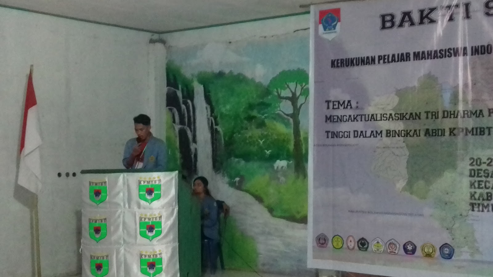 Dalam Sambutannya, Ketua Umum KPMIBT, Anjas Ambarak mengatakan, adapun esensi dari tujuan kegiatan kami, dengan tema mengaktualisakan tri dharma perguruan tinggi dalam bingkai abdi KPMIBT, untuk menunjukan keperdulian kami mahasiswa paguyuban KPMIBT Boltim yang telah melanjutkan pendidikan di kota manado, untuk mengabdi kepada masyarakat Bolaang Mongondow Timur.
