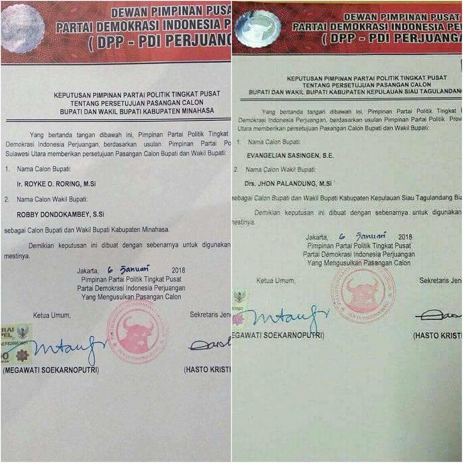 Adapun informasi isi dari surat yang ditandatangani diatas meterai 6000 yang diterima wartawan bahwa untuk Pilkada Minahasa, PDIP telah menetapkan calon Bupati kepada Royke O Roring yang berpasangan dengan Robby Dondokambey (calon Wakil Bupati) dan untuk Pilkada di Kabupaten Kepulauan Siau, Tagulandang Biaro (Sitaro), PDIP mempercayakan Evangelian Sasingen (calon Bupati) yang berpasangan dengan, Jhon Palandung (calon Wakil Bupati). (Isjo)