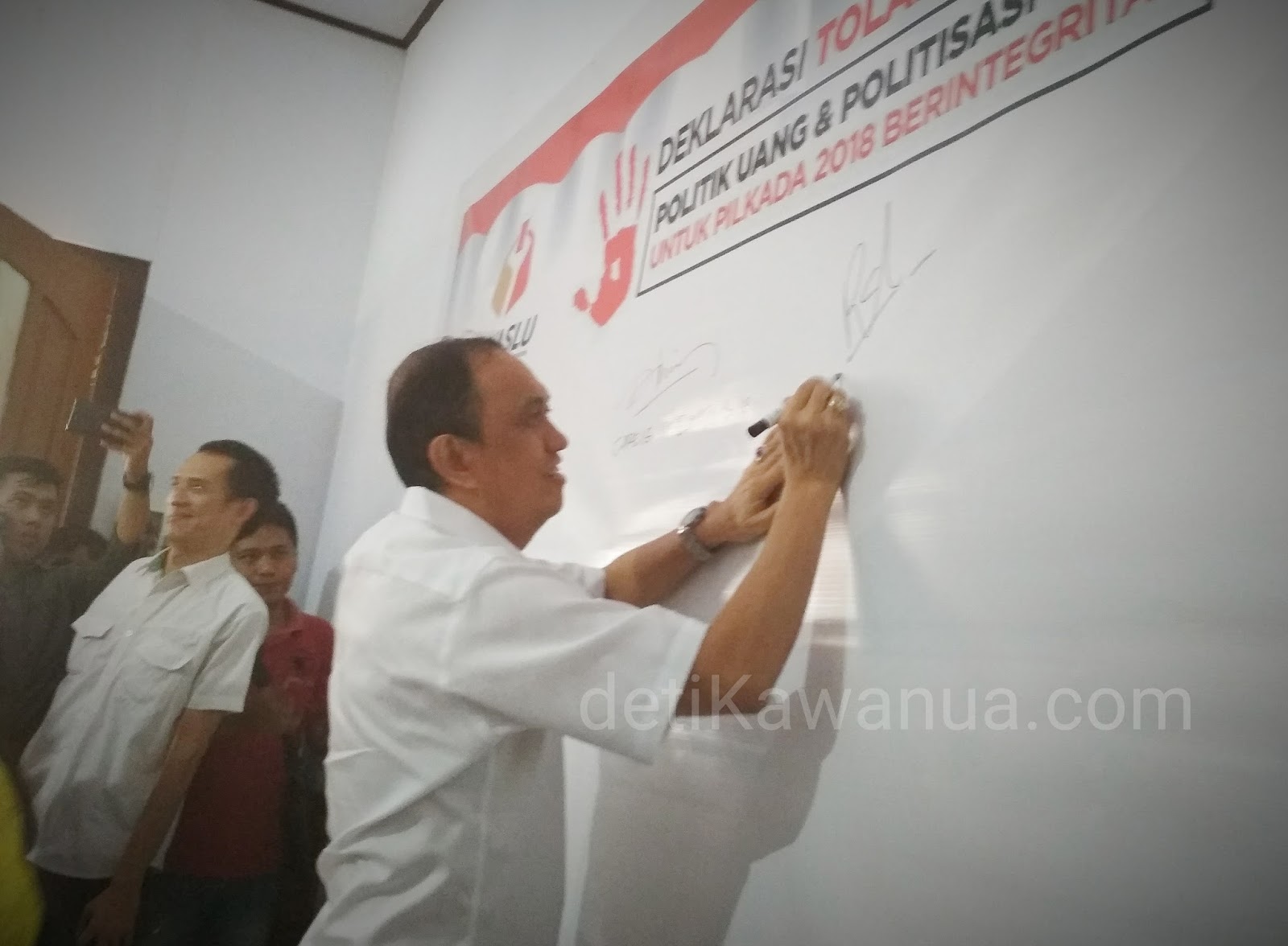 Minahasa, detiKawanua.com –  Menghadiri undangan Panwaslu Minahasa, Pasangan calon (Paslon) Bupati dan Wakil Bupati Minahasa periode 2018-2023 nomor urut 2 dari PDIP, Roy Roring dan Robby Dondokambey (RR-RD/R3D) pada Rabu (14/02) sore tadi, melalui Roy Roring yang saat itu mengenakan pakaian kemeja putih dan celana hitam hadir mengikuti agenda Sosialisasi dan Deklarasi Tolak Politik Uang dan Politisasi SARA untuk Pilkada 2018 Berintegritas.