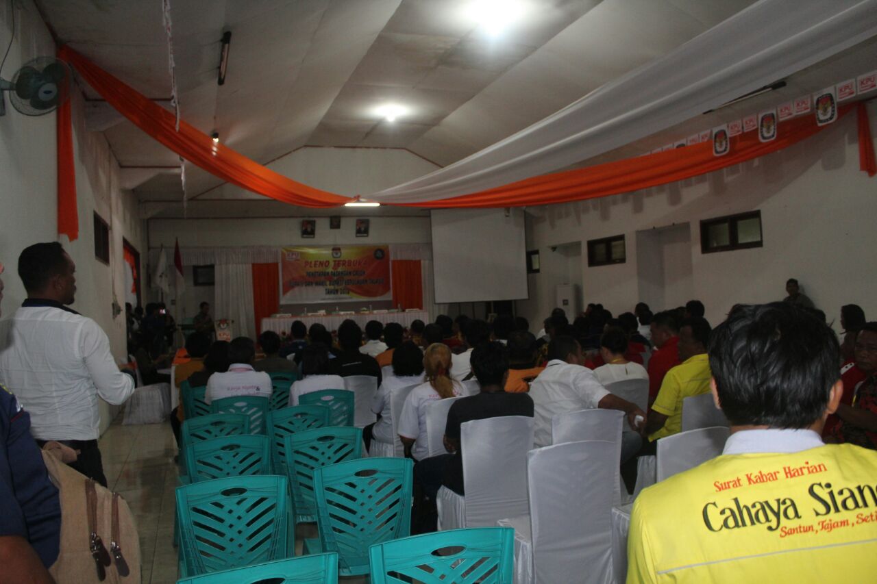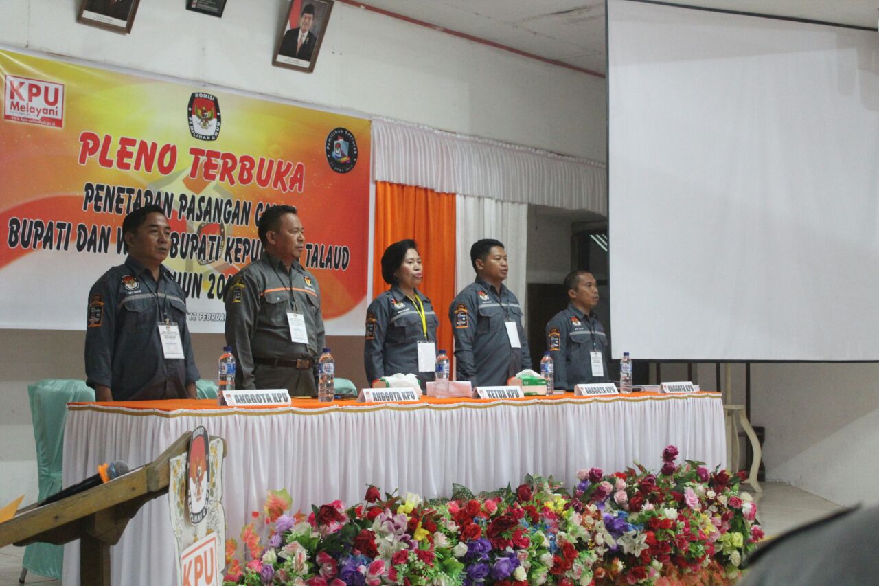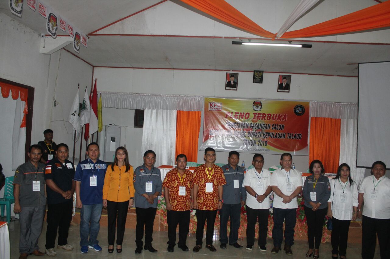 Berdasarkan hasil verifikasi administrasi dan verivikasi faktual yang telah dilakukan dan ditetapkan lewat Rapat Pleno lima (5) komisioner Komisi Pemilihan Umum Kabupaten Kepuluan Talaud Empat pasangan bakal calon Bupati dan Wakil Bupati Kepulauan Talaud yang telah mendaftar dan mengikuti berbagai tahapan sebelumnya pada, Senin (12/2), akhirnya ditetapkan memenuhi persyaratan menjadi pasangan calon ( Paslon ) peserta yang akan berkompetisi pada pesta demokrasi pemilihan kepala daerah 27 juni mendatang. Demikian disampaikan Ketua Divisi Teknis KPU, Rahma Zakhawerus saat membacakan berita acara pleno terbuka penetapan pasangan calon bupati dan wakil bupati yang memenuhi persyaratan menjadi peserta pemilihan bupati dan wakil bupati kepulauan Talaud.