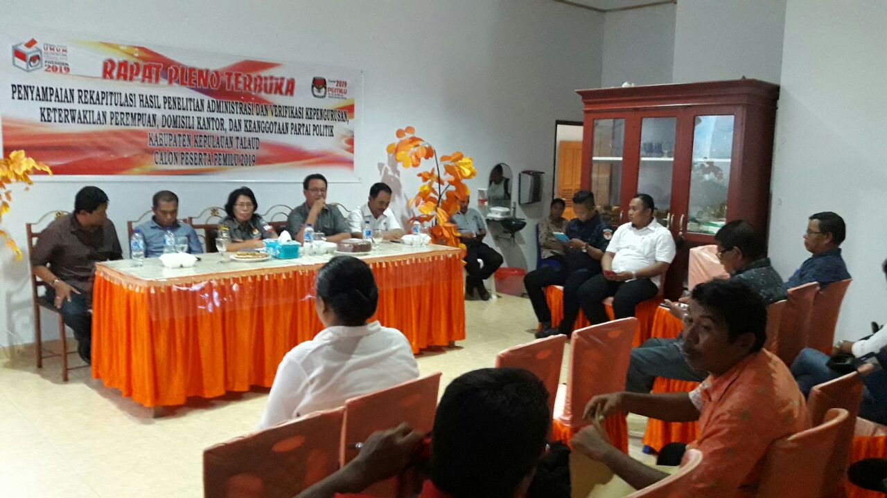 Talaud, detiKawanua.com – Pentingnya penyelenggaraan Pemilihan Umum (Pemilu) Tahun 2019 mendatang, KPU Kabupaten Kepulauan Talaud laksanakan ‘Rapat Pleno Terbuka Penyampaian Rekapitulasi Hasil Penelitian Administrasi dan Verifikasi Kepengurusan, Keterwakilan Perempuan, Domisili Kantor dan Keanggotaan Partai Politik Kabupaten Kepulauan Talaud Peserta Pemilu 2019’, Pukul 13.00 Wita Kamis (8/2) di Aula Hotel Permata II Melonguane.