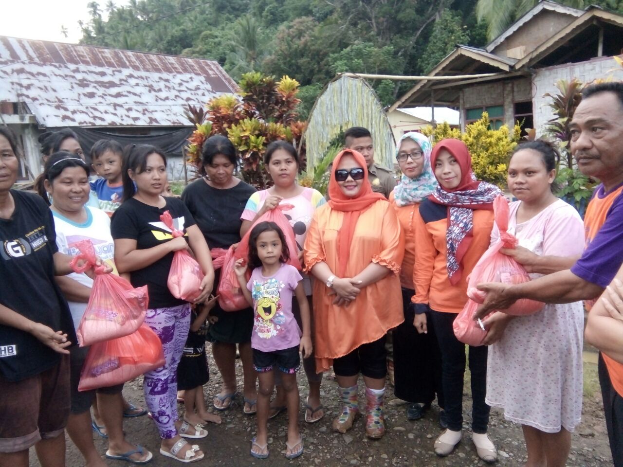 Disela-sela kunjungannya, istri Bupati Boltim, Sehan Salim Landjar SH tersebut, membagikan bantuan berupa bahan Sembilan bahan pokok (Sembako) serta pakaian sekolah kepada siswa-siswi yang terkena banjir.