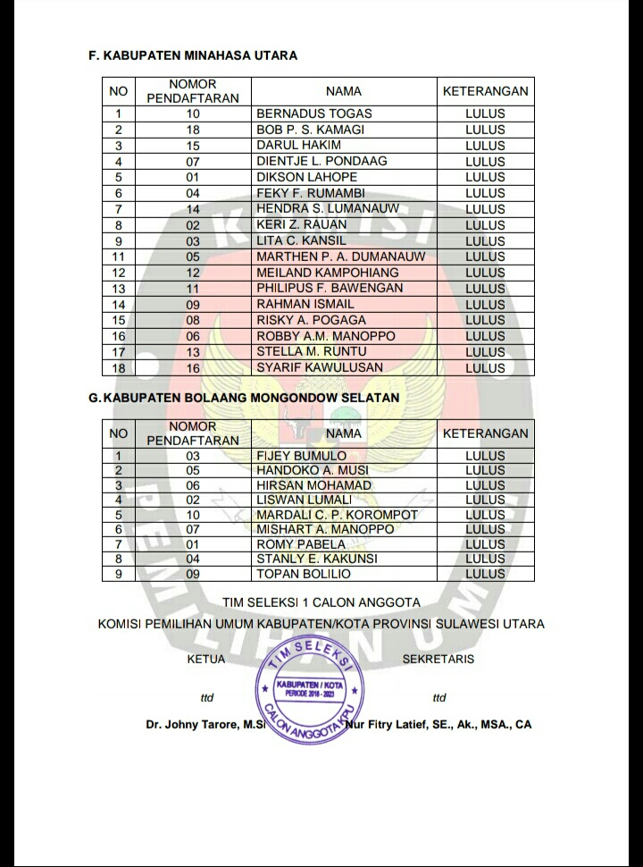 Berdasarkan Rapat Pleno Timsel 1 pada Selasa (20/03), yang dilansir dari situs resmi www.kpusulutprov.go.id pada Rabu (21/03), nama-nama tersebut lulus administrasi untuk menjadi calon komisioner KPU di tujuh kabupaten/kota yakni Manado, Bitung, Minut, Tomohon, Minahasa, Bolmong Selatan, dan Bolmong Timur.