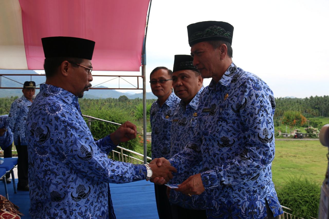 Penyerahan Kartu Taspen secara simbolis oleh Bupati Sehan kepada Sekda Assagaf pada apel korpri di Kantor Bupati Boltim.