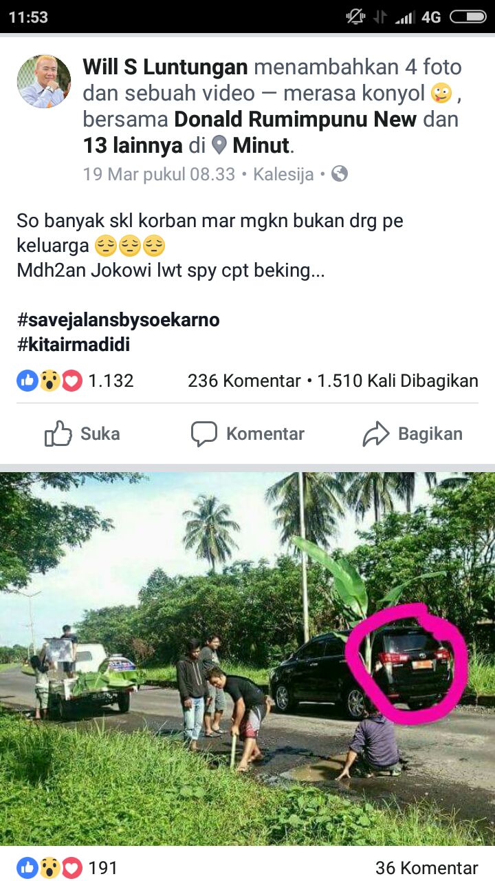 Minut, detiKawanua.com – Menjadi sorotan masyarakat dan viral di media sosial (Medsos) Facebook milik warga di Kabupaten Minahasa Utara (Minut), persoalan ruas jalan di Kompleks Jalan Soekarno Minut yang juga merupakan jalur melewati rumah kediaman Gubernur Sulut (Olly Dondokambey), terdapat disejumlah titik rusak berlubang dan sering menimbulkan korban kecelakaan.