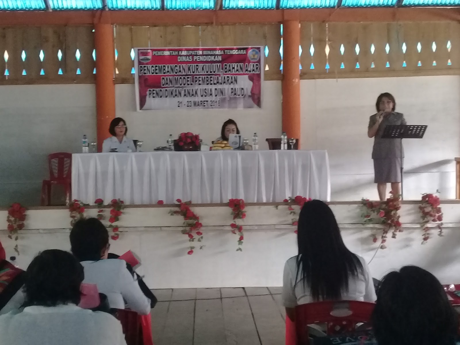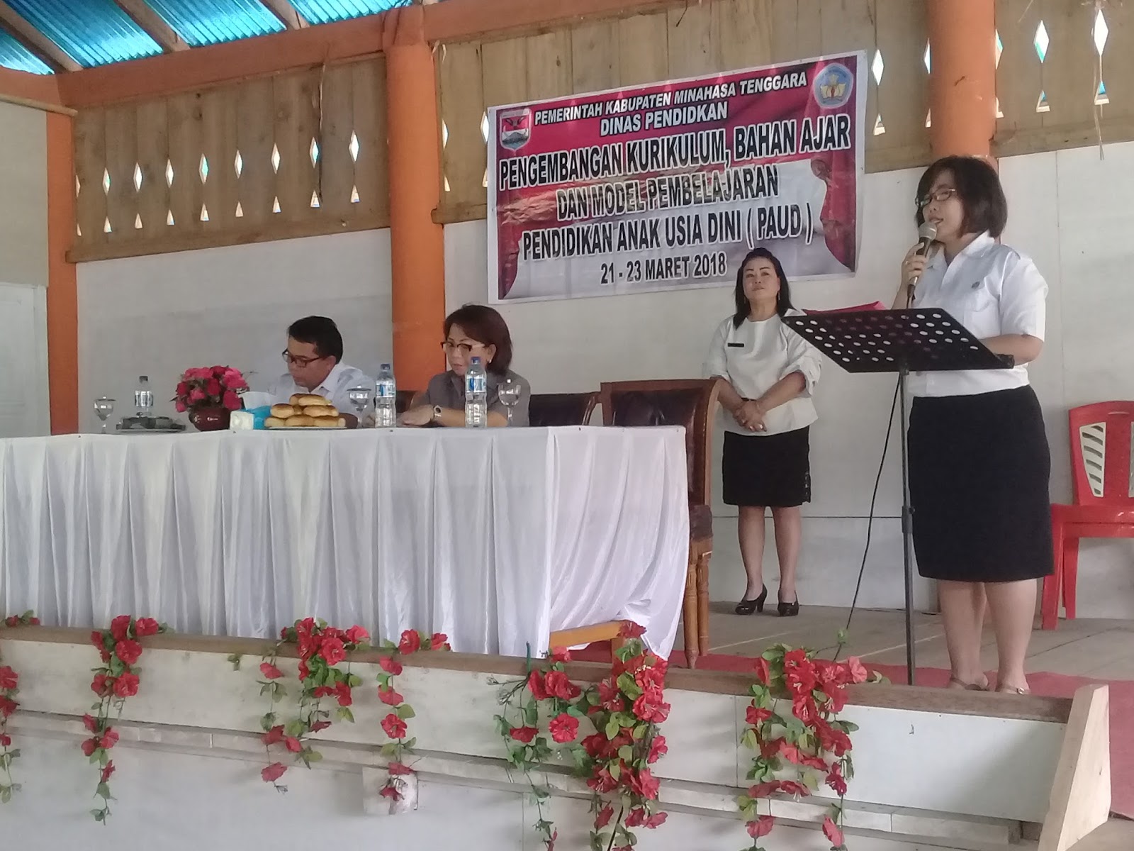 sebelumnya kepala bidang Paud dan Dikmas Sarah Kindangen dalam laporan mengatakan kegiatan yang akan dilaksanakan aelama tiga hari ini ,berasal dari anggran APBD Pemkab Mitra bertujuan agar para pendidik mampu memahami pengembangan kurikulum 2013 serta meningkatkan kemampuan mempersiapkan perangkat pembelajaran dan standart pelayanan Minimal (SPM) dengan menghadirkan langsung perwakilan Direktorat Pembinaan PAUD KEMENDIKBUD Yakni Sari Setyaningrum dan Eko Tri Rakmawati sebagai narasumber.