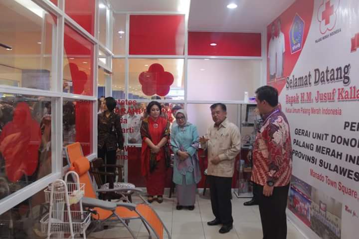 Manado, detiKawanua.com – Dalam kujungan sekaligus meresmikan Gerai Unit Donor Darah Milik Palang Merah Indonesia (PMI) Sulut di Kompleks Mantos Manado, Senin (19/03) siang tadi. Wakil Presiden RI, Yusuf Kalla (JK) bersama Ibu Mufida Jusuf Kalla didampingi Gubernur Sulut, Olly Dondokambey, Wakil Gubernur, Steven Kandouw, Ketua TP PKK Sulut, Rita Dondokambey-Tamuntuan beserta Wakil Ketua Ketua, Kartika Devi Kandouw Tanos, usai prosesi pengguntingan pita langsung melihat keadaan serta menyapa 6 orang pendonor darah yang terbaring dibangsal Gerai PMI Sulut tersebut.