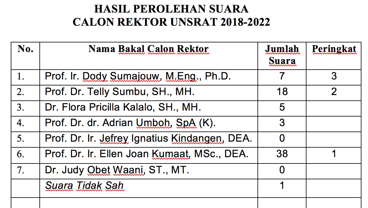 Dalam Rapat Senat UNSRAT yang digelar Rabu (11/04/2018), di Auditorium UNSRAT lalu dilanjutkan di Kantor Rektorat, tiga nama bakal calon dari tujuh calon yang menyampaikan visi dan misi, dinyatakan menjadi Calon Rektor UNSRAT periode 2018-2022, yaitu: