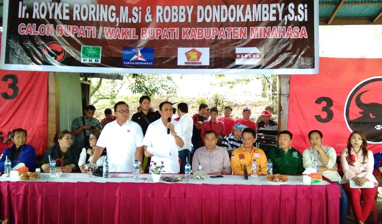 Minahasa, detiKawanua.com – Menerima informasi akurat dan terpercaya tentang posisi elektabilitas kemenangan Pasangan Calon (Paslon) Bupati dan Wakil Bupati Minahasa Periode 2018-2023 nomor urut 2, Royke O.Roring dan Robby Dondokambey (ROR-RD) yang saat ini telah berada diatas 60 persen, tidak membuat kedua paslon usungan PDI Perjuangan dan didukung 4 partai (Hanura, Gerindra, Demokrat dan PKB) itu berbangga diri namun mengajak tetap santun dan menjaga kedamaian selama menjalani proses Pilkada Serentak Minahasa yang puncaknya tanggal 27 Juni mendatang.