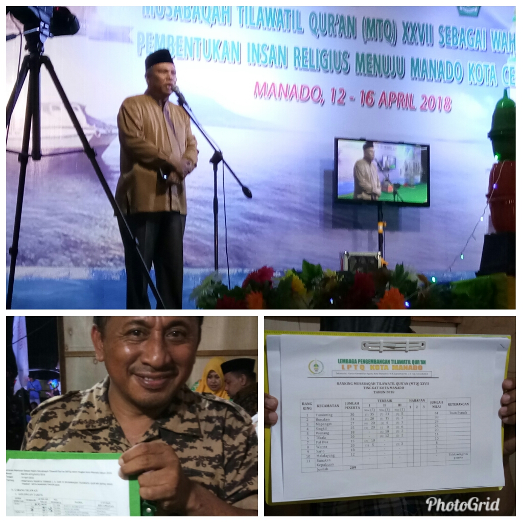 “Juara Umum MTQ ke-27 Kota Manado Tahun 2018, adalah Kecamatan Tuminting,” ucap KH Abdul Wahab Abdul Ghofur selaku Ketua Dewan Hakim MTQ ke-27 Kota Manado.