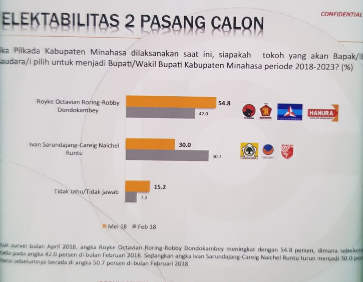 Minahasa, detiKawanua.com – Hasil elektabilitas salah satu lembaga survei tingkat nasional yang sempat viral di media sosial (Medsos) Facebook, bahwa sosok pasangan calon (Paslon) Bupati Wakil Bupati Minahasa Periode 2018-2023 Nomor Urut 2, Royke O.Roring dan Robby Dondokambey (ROR-RD/R3D) masih pada angka tertinggi 54.8 persen mengungguli Paslon Ivan Sarundajang-Careigh Natichel Runtu (Ivansa-CNR) yang hanya 30 persen. Adapun survei yang dilakukan sejak tanggal 7 sampai 15 Mei 2018 itu juga dari informasi yang diterima, dari responden yang di survei ada sekitar 15,2 persen yang menjawab tidak tahu.