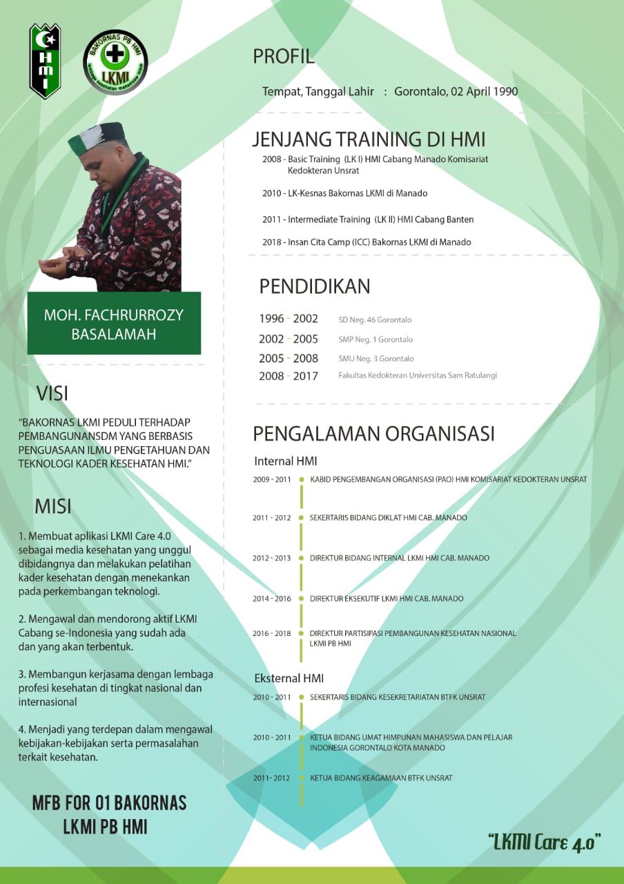 Moh Fachrurrozy Basalamah (MFB) yang juga mahasiswa Fakultas Kedokteran Universitas Sam Ratulangi Manado, mengatakan, “Siap maju dan bersaing dengan kader lain dalam pemilihan Direktur Bakornas LKMI PB HMI beliau maju atas dukungan kader kader LKMI. Niat saya ikhlas dan tulus, demi membangun dan memajukan Bakornas LKMI PB HMI ini”.