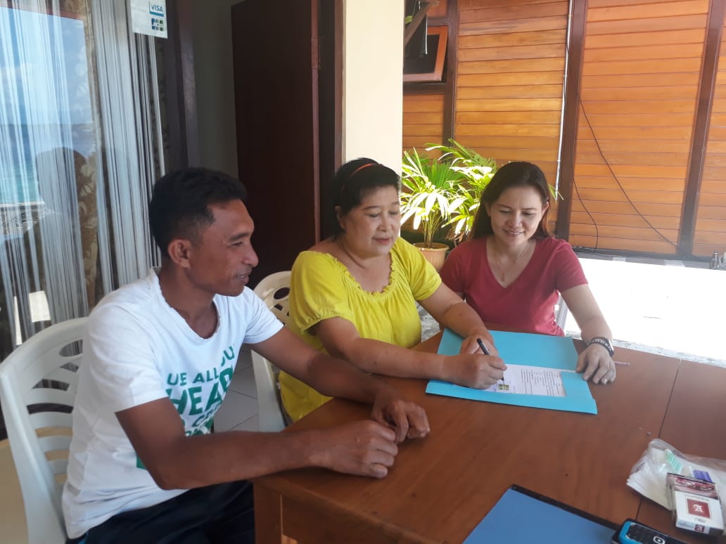 PEMILIK lahan Ibu Penina Sangari yang menandatangani dan penyerahan surat hibah lahan untuk pengoperasian Genzet di Pulau Siladen kepada Pala Lingkungan VII Ronny Bawekes dan disaksikan oleh pemerhati masyarakat kepulauan Manado, Daisy Ch Rompas.(foto: ist)