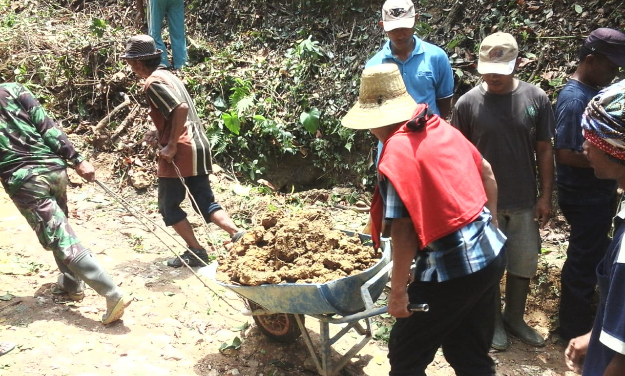 Tepatnya di salah satu lokasi penggarapan jalan makadam, nampak satgas TMMD dan warga setempat gotong royong dengan medan jalan yang cukup terjal dan menanjak.