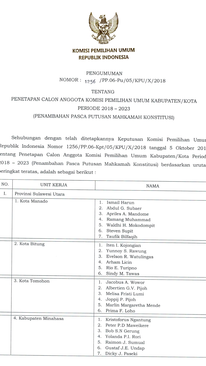 Manado, detiKawanua.com – Komisi Pemilihan Umum Republik Indonesia (KPU RI) mengumumkan tambahan Anggota KPU Kabupaten/Kota Sulawesi Utara (Sulut) periode 2018-2023.