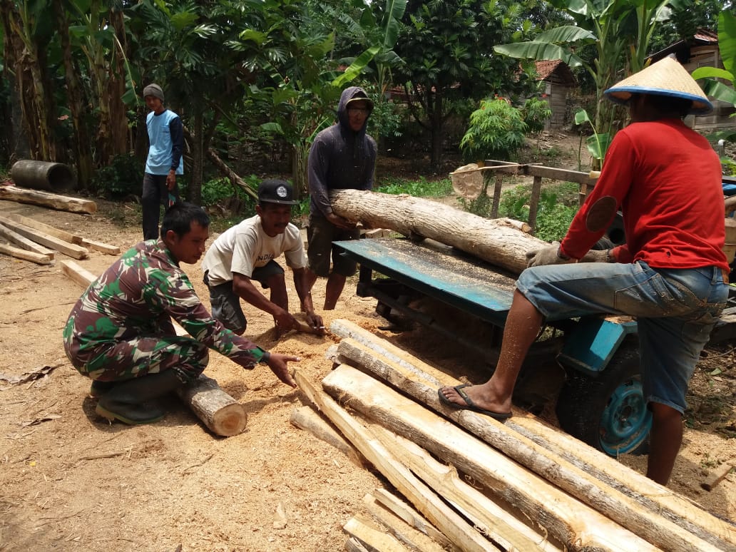 Serda Wiji Sutrisno terlihat membantu menggergaji kayu jadi untuk dijadikan balok, reng dan yang lainnya, “kepedulian, rasa ikhlas dan antusias warga yang mulai simpatik dengan TNI dan tetangganya, maka pembangunan RTLH milik Bapak Sarji (57) dengan banyak sumbangan tenaga, material kayu dan mesin pemotong kini tinggal dalam tahap kerangka rumah dan pengecoran teras. Kekurangan dan keterbatasan material kayu, disiasati warga dengan menyumbangkan beberapa pohon jatinya untuk dipotong guna membantu pak Sarji,” ungkap Bapak Tumijan yang juga tetangga pak Sarji.