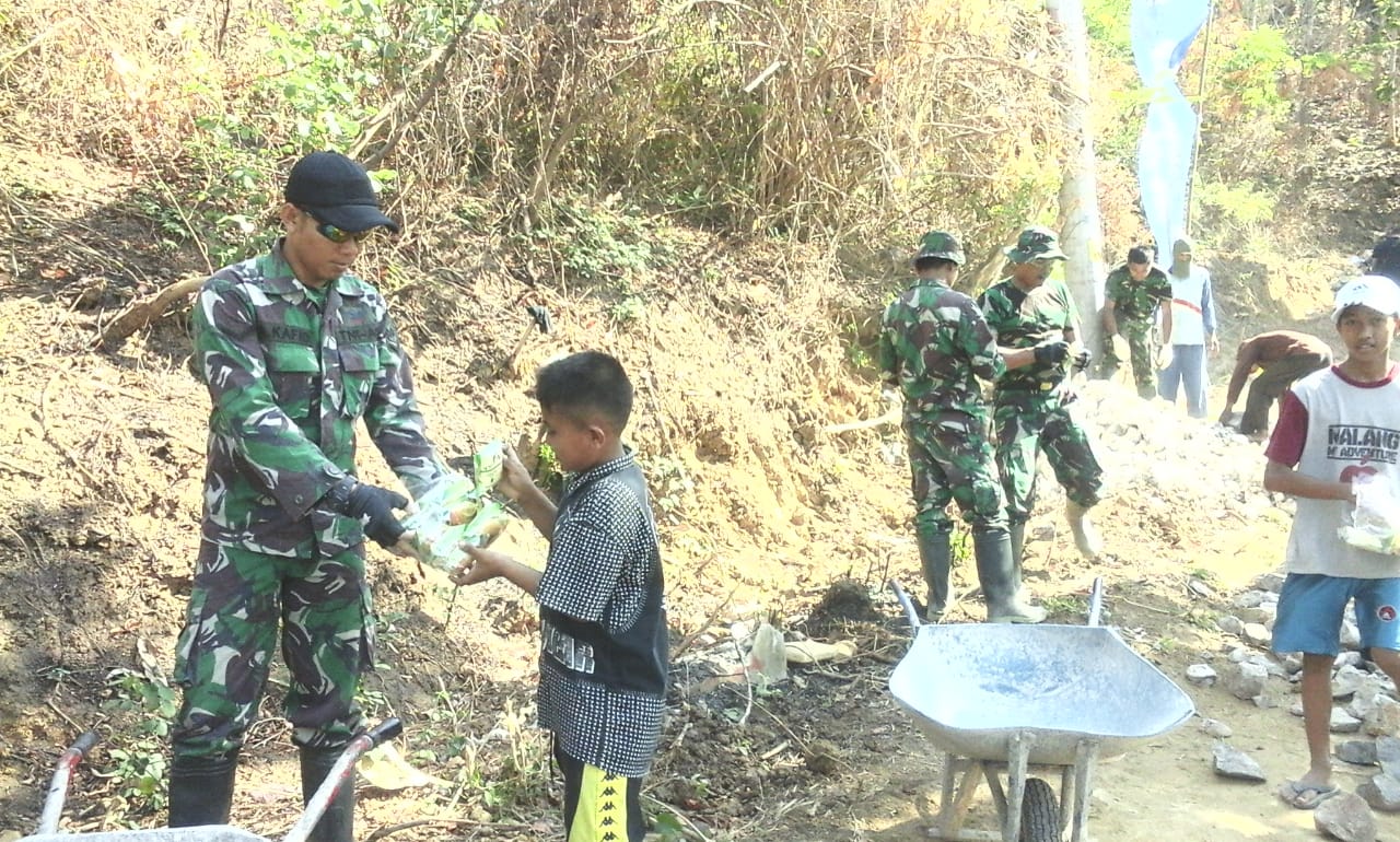 Suasana dilokasi TMMD begitu tampak semangat dan penuh keakraban, disalah satu sisi pengerjaan jalan makadam terlihat seorang anak sedang membagikan roti untuk Satgas TMMD dan warga yang sedang bekerja. Luki (9th) menghampiri Anggota Satgas TMMD dengan membawakan sebuah roti untuk dibagikan. “Om Tentara, ini ada roti untuk mengganjal perut.” Ungkapnya.