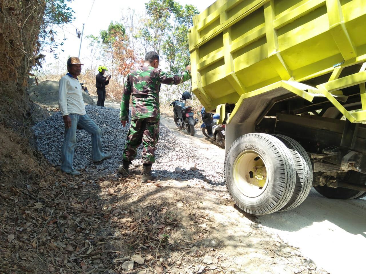 Anggota satgas TMMD Reguler ke 103 untuk membantu droping material yang kadang kala ada kendala karena jalan yang jelek lagi pula tanjakan yang terjal tidak jarang kendaraan pengangkutnya mengalami kendala dijalan.