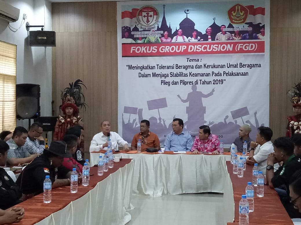 Manado, detiKawanua.com – Jelang Pemilu 2019 mendatang, resistensi antar kelompok patut diwaspadai. Untuk itu Ormas Kristen Laskar Benteng Indonesia dan Banser Kota Manado menggelar Focus Group Discussion (FGD). Diskusi yang dihadiri seluruh ormas keagamaan dan kepemudaan itu mengangkat tema ‘Meningkatkan Toleransi Beragama dan Kerukunan Umat Beragama Dalam Menjaga Stabilitas Keamanan Pada Pelaksanaan Pileg dan Pilpres Tahun 2019’ dan digelar di salah satu hotel di jalan Martadinata, Kamis (13/12/2018) kemarin.
