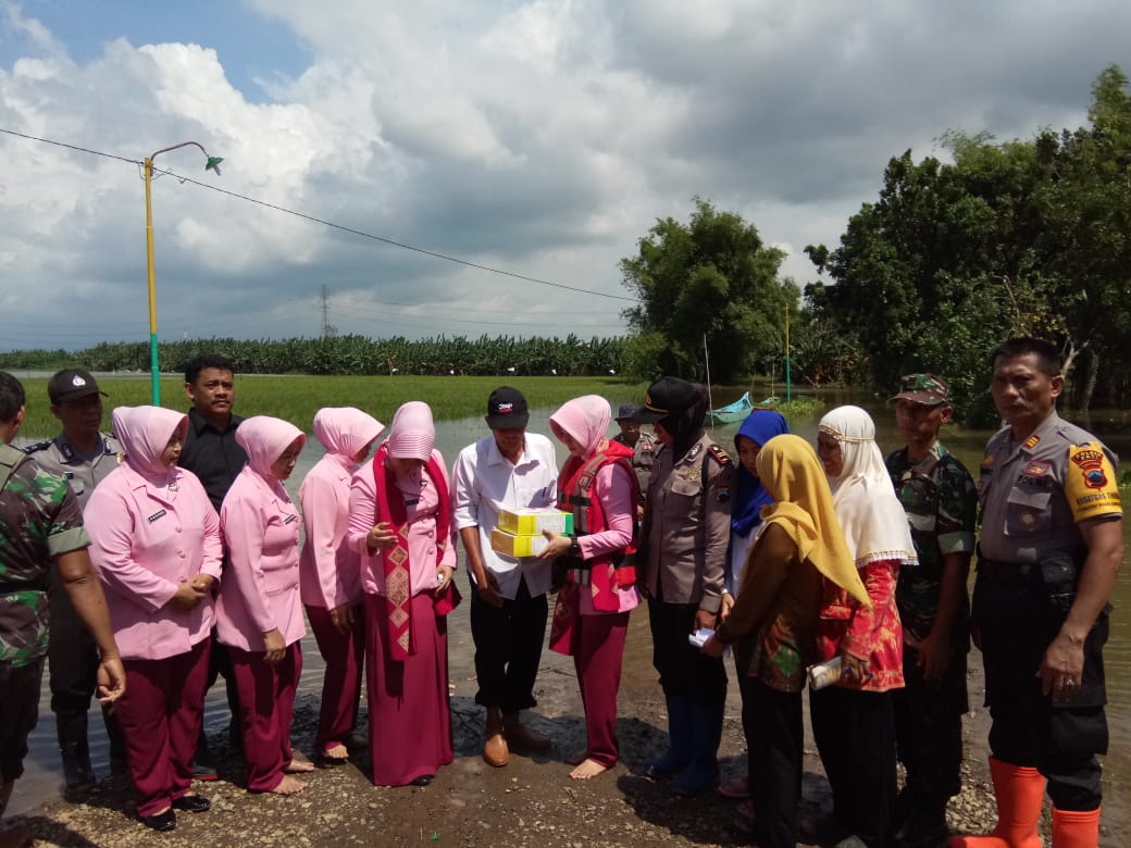 Ny Ria Jon Wesly Arianto ketua Bhayangkari Polres Pati di dampingi Wakil Ketua Ny Indri Danu Pamungkas, di samping beri Bantuan juga bersilaturahmi kepada warga yang rumahnya terkena dampak musibah banjir yang melanda desa tersebut.