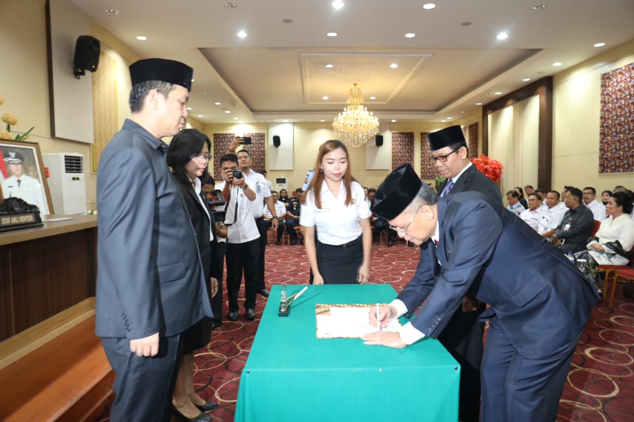 Manado, detiKawanua.com – Serah terima jabatan (Sertijab) di lingkungan Kantor Wilayah Hukum dan HAM Sulut pada, Rabu (16/01) yang dilaksanakan di Ruang CJ. Rantung Kantor Gubernur Sulut, antara Kepala Kanwil lama, Murdjito Sasto kepada Kakanwil yang baru, Efendy B. Peranginangi, disaksikan Wakil Gubernur Sulut, Steven Kandouw bersama Staf Ahli Menteri Hukum dan HAM RI, Min Usihen.
