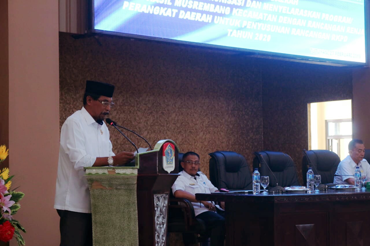 Bupati dalam sambutannya pada kegiatan forum perangkat daerah, dalam rangka sinkronisasi dan menyelaraskan program dan kegiatan hasil Musyawarah Perencanaan Pembangunan (Musrenbang) kecamatan dengan rancangan Rencana Kerja (Renja) perangkat daerah untuk penyusunan rancangan Rencana Kerja Perangkat Daerah (RKPD) tahun anggaran 2020 pada Rabu (27/02) di lantai tiga Kantor Bupati, menegaskan bahwa SKPD harus mengkaji setiap usulan perencanaan program pembangunan dari Desa.