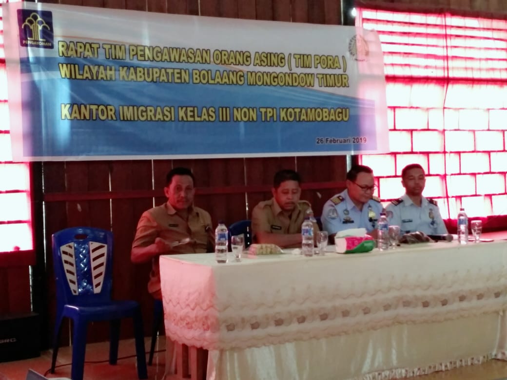 Sementara, Kepala Kantor Imigrasi kelas III Non TPI Kotamobagu, Joni Rumagit juga menuturkan, Camat dan Kepala desa (Sangadi-red) harus tahu tentang penduduknya, harus pro aktif dalam pengawasan orang asing, itu dibuktikan dengan KTP-nya. Dan saling koordinasi dengan instansi terkait tentang pelaporan data orang asing.