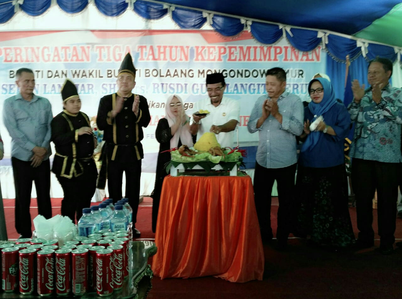 Bupati Boltim memotong tumpeng saat Refleksi 3 Tahun Kepemimpinan Sehan Salim Landjar – Rusdi Gumalangit (SERU).