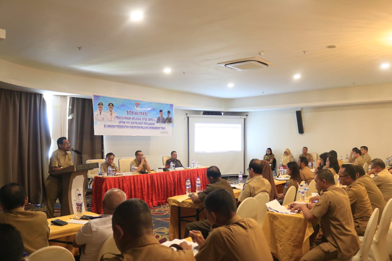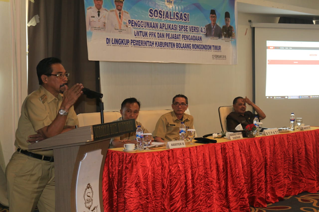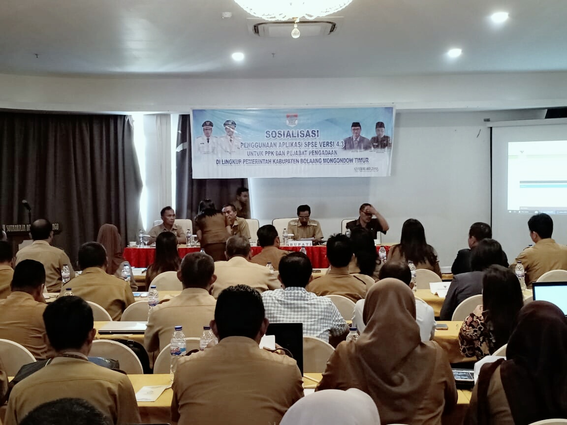 Boltim, detiKawanua.com – Untuk merealisasikan komitmen bersama dalam mewujudkan pemerintahan yang bersih dan bebas Korupsi Kolusi dan Nepotisme (KKN), Pemerintah Kabupaten Bolaang Mongondow Timur (Pemkab Boltim), menyelenggarakan sosialisasi penggunaan aplikasi Sistem Pengadaan Secara Elektronik (SPSE) versi 4.3 untuk Pejabat Pembuat Komitmen dan Pejabat Pengadaan.