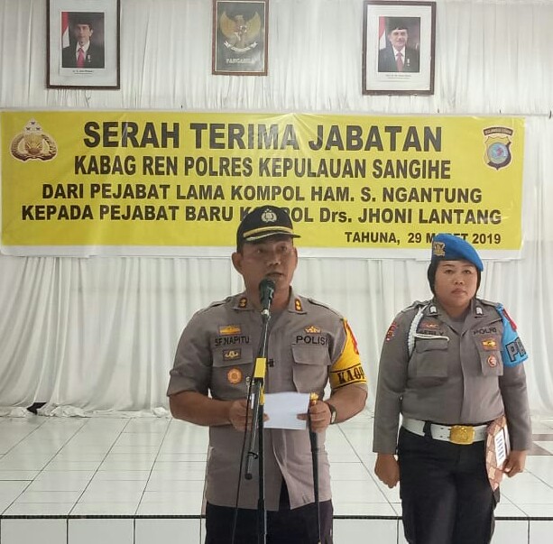 Tahuna, detikawanua.com – Polres Sangihe kembali melaksanakan sertijab giat tersebut dilaksanakan di aula Bhayangkara Polres Sangihe Jumat 29-3-2019 Serah Terima Jabatan Kepala Bagian Perencanaan (Kabag Ren) Polres Sangihe dari pejabat lama Kompol H.S. NGANTUNG kepada Kompol Drs. JHONY LANTANG.