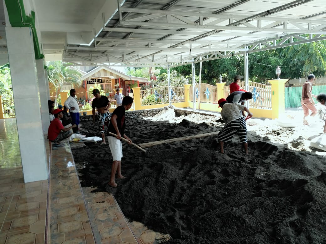 Lanjut dikatakannya, hari ini Senin (4/3/2019), kita melakukan penimbunan pondasi dasar, selanjutnya besok akan dicor serta pemasangan tehel.