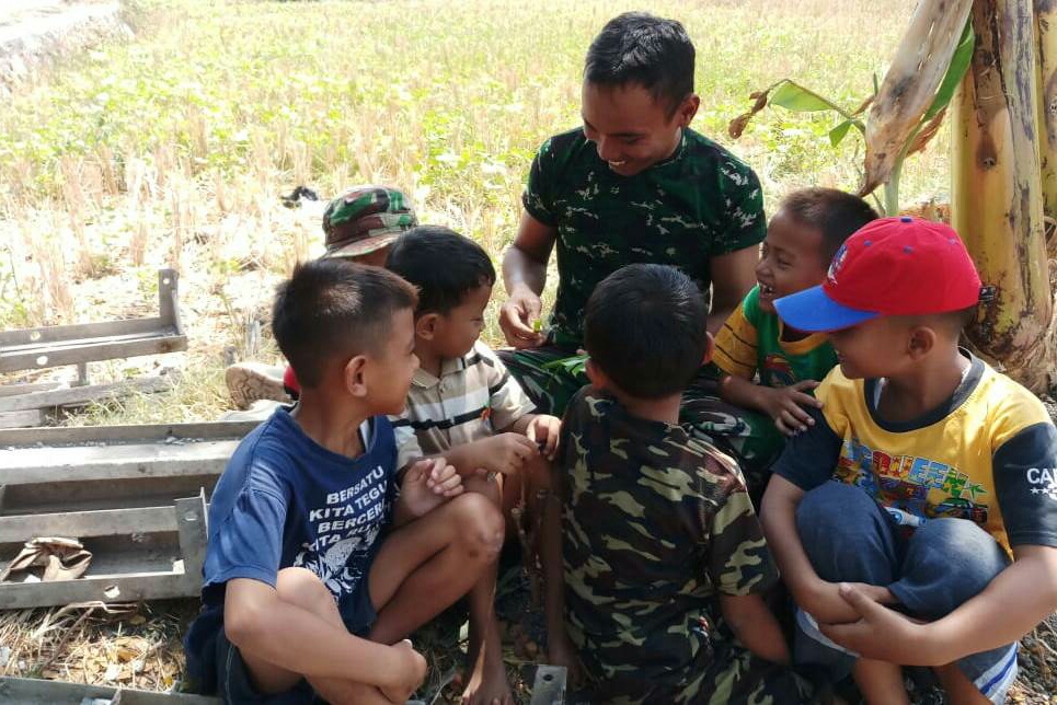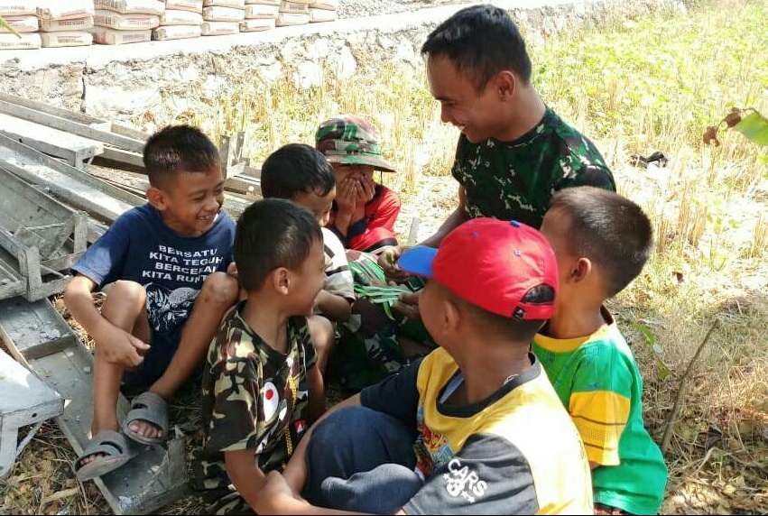 Seperti halnya yang dilakukan Praka Hambali, salah satu anggota Satgas TMMD, yang selalu meluangkan waktu bercengkerama dengan anak-anak di Desa Kalikondang. Banyak hal yang ia lakukan yang terpenting anak-anak senang dan cerita.