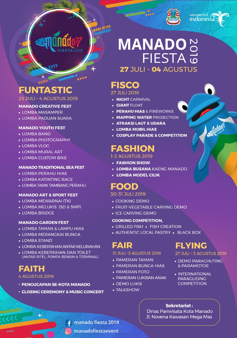 FUNTASTIC: 25 Juli – 4 Agustus 2019, di beberapa tempat:, Masamper dan Youth Fest di Taman Berkat, Lomba Paduan Suara di Gedung Serbaguna Kantor Walikota Manado, Bridge International di Four Point, dan lain-lain.