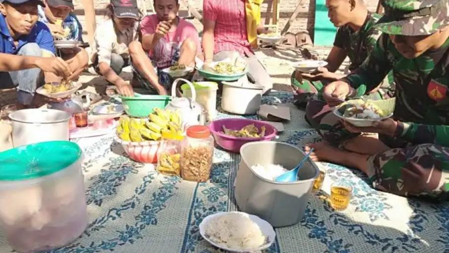 Minggu (28/7/2019) pagi, sebelum melanjutkan perehapan Rumah Tidak Layak Huni (RTLH) milik Mbah Sarni Dukuh Prigi RT.3 RW.5 Desa Kalikondang, anggota Satgas TMMD Reg 105 dan warga Dukuh Prigi, menggelar acara doa bersama yang dipimpin oleh Kyai Mastur (Tokoh agama Dukuh Prigi) yang dirangkaikan dengan acara ritual adat “Banca’an” (selamatan, red).