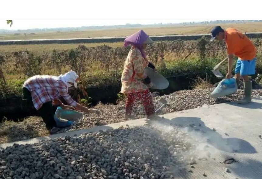 Suyati dengan Ny Siti (35), tampak begitu giat mengumpulkan pasir batu yang akan digunakan untuk mengecor jalan. Dengan menggunakan alat manual berupa cangkul dan serok, pasir batu mereka kumpulkan dan dipindahkan ke ruas jalan yang dipersiapkan akan dicor.