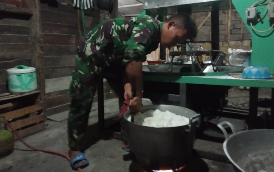 Sebelum berangkat ke lokasi pembangunan TMMD, Pra Feby membantu menanak nasi untuk sarapan pagi rekan-rekannya sesama anggota Satgas.