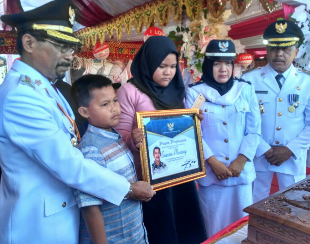 Bupati Boltim Sehan Landjar memberikan penghargaan kepada alm. Candra Modeong yang diterima oleh istri dan kedua anaknya.